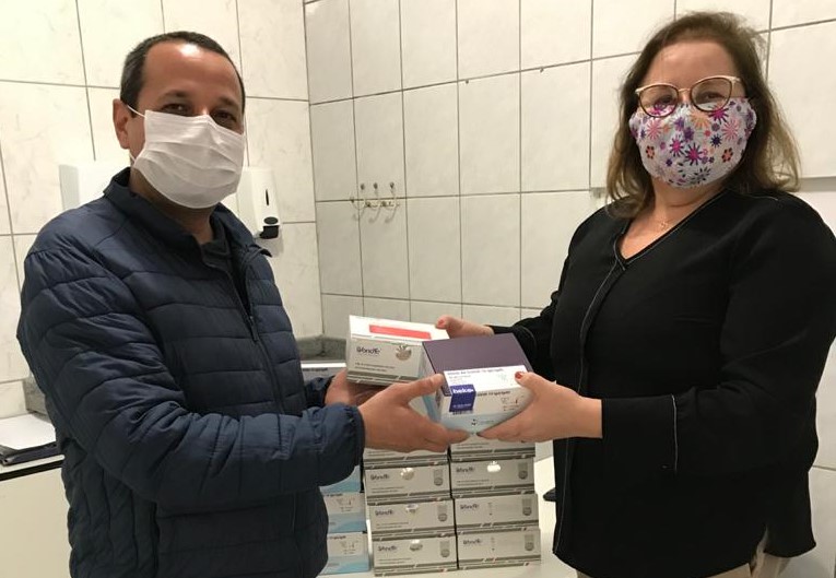 A Secretaria de Saúde recebeu, nesta terça-feira (9), um total de 1.160 testes rápidos para diagnóstico do COVID-19. O material foi entregue ao coordenador das ações de combate ao Coronavírus no município, o enfermeiro da Vigilância Epidemiológica, Fernando Di Frank.