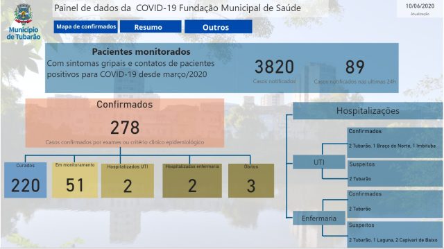 A plataforma poderá ser acessada no site da prefeitura de Tubarão: (www.tubarao.sc.gov.br) e nela, a qualquer momento, poderão ser consultadas informações como casos confirmados por bairro, média de idade, curados, em monitoramento e óbitos. “Nós já emitíamos um boletim diário, porém, neste painel, que será atualizado sempre às 17 horas, será possível ter acesso a outros dados, como, por exemplo, os testes realizados e sintomas. Por meio de gráficos e tabelas estarão detalhados todos os números, desde o início da pandemia”, explica o diretor-presidente da Fundação Municipal de Saúde (FMS), Daisson Trevisol.