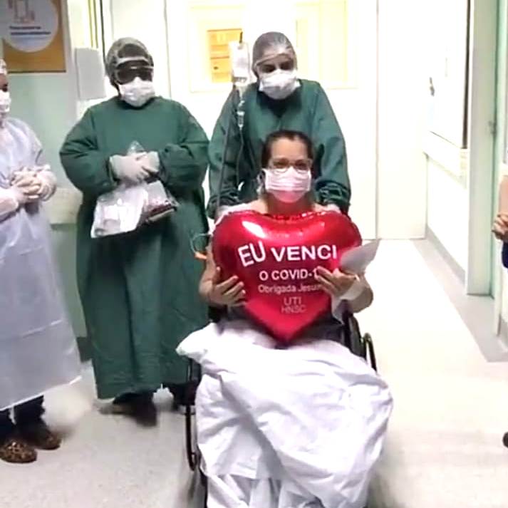 A filha entregou um balão para a mãe em forma de coração escrito: “Eu venci a Covid-19, obrigado, Jesus”. Delma ainda permanecerá por alguns dias na enfermaria, em observação, para depois voltar para o conforto do seu lar.