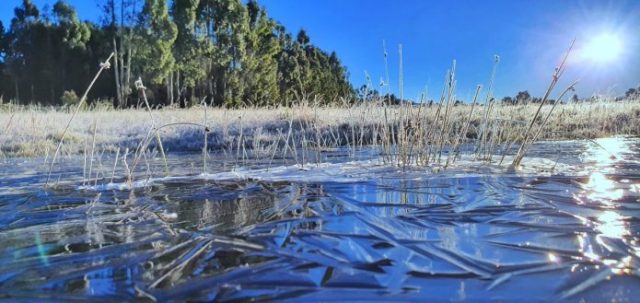 Um lago congelou após o forte frio do amanhecer desta sexta (10), que culminou no dia mais gelado de julho até então. No Vale do do Caminhos da Neve, a geada e as baixas temperaturas provocaram até mesmo o congelamento de um lago, em São Joaquim.