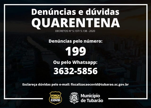 Desta feita, as denúncias podem ser feitas através do telefone 199, ou ainda pelo WhatsApp (48) 3632-5856. Caso você precise sanar alguma dúvida sore o decreto, e o período de quarentena em si, use o e-mail fiscalizacaocovid@tubarao.sc.gov.br .