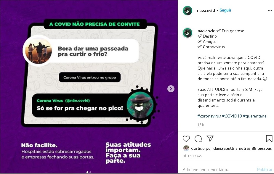 A criação da campanha teve a contribuição voluntária das empresas de comunicação Base 48, Up Marcas, Mude, Ludicoz, além de outros profissionais da área de comunicação. Para isso, as redes sociais serão utilizadas amplamente, além de veículos de outros veículos de mídia. O objetivo é frear a pandemia para além da quarentena, através de um apelo para acabar com os pequenos deslizes, considerando que a atitude de cada um hoje é o que determinará o futuro de todos amanhã. O perfil oficial da campanha no Instagram é @nao.covid.