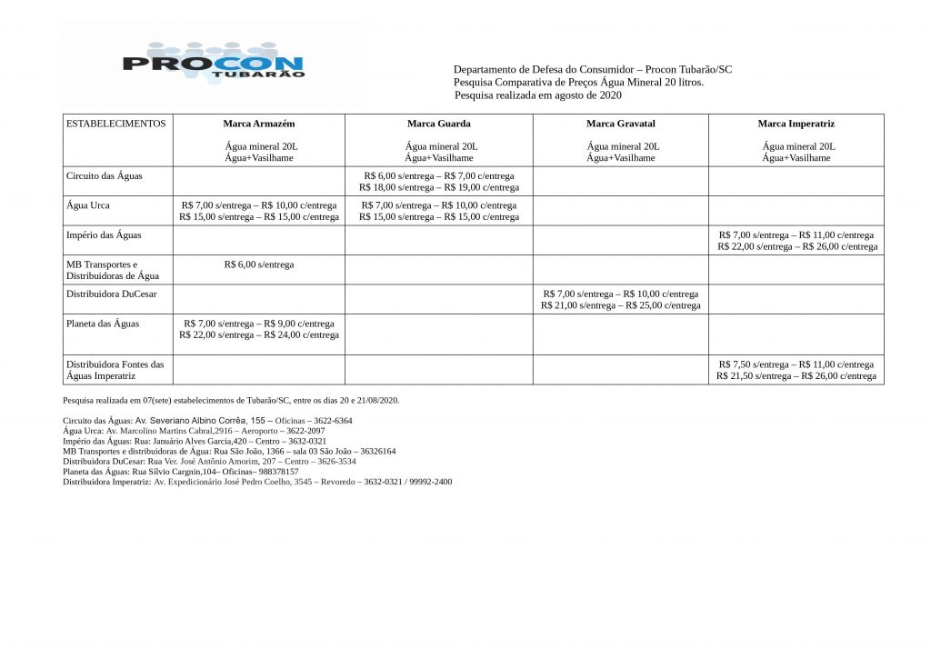 O Procon de Tubarão realizou uma pesquisa de preços de galões de água mineral, em diversas distribuidoras da cidade, com várias formas de venda, com e sem entrega.