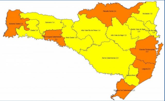 Subiu para dez o número de regiões em nível alto para Covid-19 em Santa Catarina. Agora, as regiões em nível alto (amarelo) são: Oeste, Xanxerê, Meio-Oeste, Alto Vale do Rio do Peixe, Alto Vale do Itajaí, Serra Catarinense, Médio Vale do Itajaí, Nordeste, Foz do Rio Itajaí e Carbonífera.