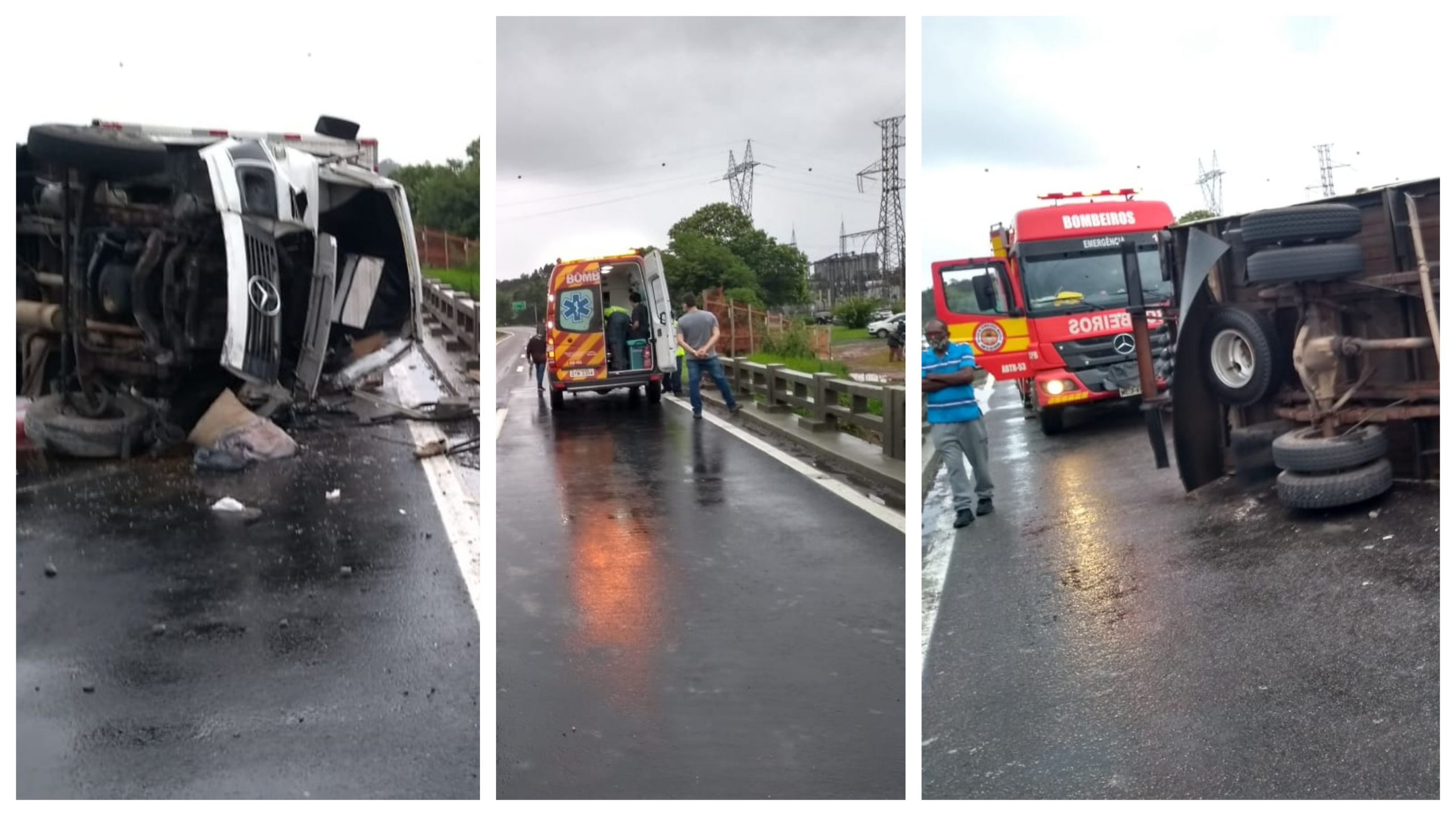 O acidente ocorreu por volta das 17h e deixou outras duas pessoas feridas. Segundo os socorristas, foi um tombamento de um caminhão Mercedes 608, polacas de Camboriú, com três ocupantes. O veículo ficou sobre a ponte e trancou as duas pistas da rodovia federal em direção Norte, o que resultou em uma fila de mais de sete quilômetros e muita lentidão em vias urbanas dos dois municípios de motoristas tentando fugir do congestionamento.