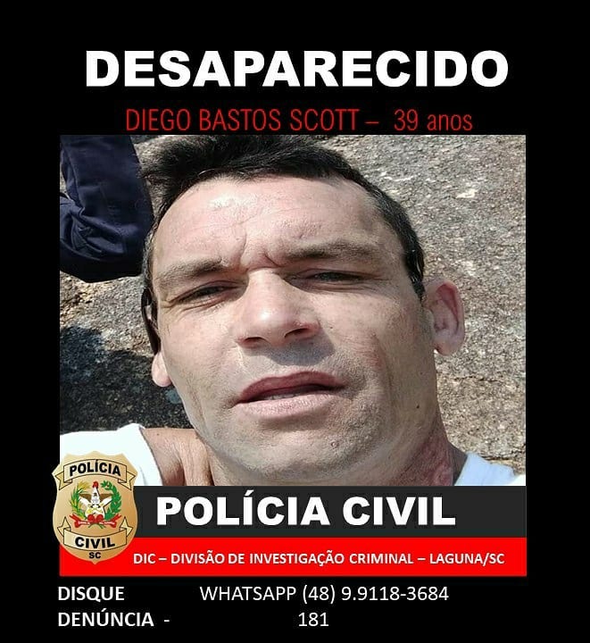 “Em meio às diversas manifestações na internet, a Polícia Civil de Santa Catarina informa que, por intermédio da sua Divisão de Investigação Criminal de Laguna, está apurando o desaparecimento de Diego Bastos Scott, após envolver-se em uma ocorrência policial no dia 15/01/2021. O caso também vem sendo acompanhado pelo Ministério Público e pela Polícia Militar. Demais informações não serão repassadas nesse momento com a finalidade de não embaraçar as investigações, que tramitam em sigilo. Importante: qualquer detalhe sobre o paradeiro de Diego, ou dados relevantes relacionadas ao seu desaparecimento, poderá ser encaminhado ao contato (48) 99118-3684, cuja garantia do anonimato é assegurada”.