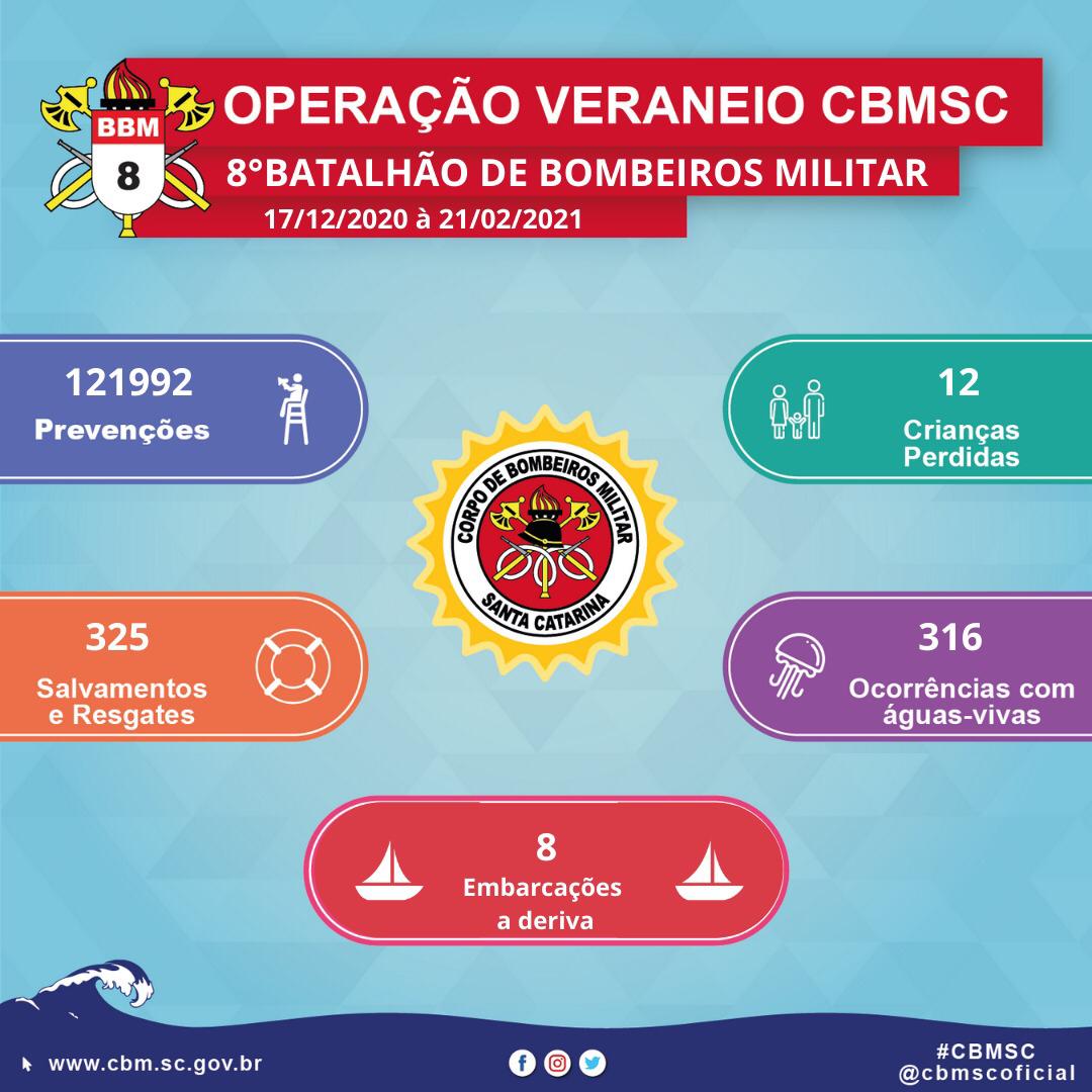 A Operação Veraneio na área do 8º BBM teve início no 17/12/2020 e nesse período atuaram em média 200 Guarda-vidas Civis e Militares por dia, em 61 postos distribuídos em 36 praias. Foram empregadas 6 motoaquáticas, 3 quadriciclos, 2 botes infláveis e 1 embarcação de resgate.