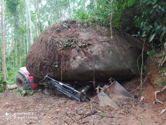 O homem estava em um trator arrumando uma estrada particular quando ocorreu um deslizamento, ficando com a perna presa entre o banco do veículo e a pedra.