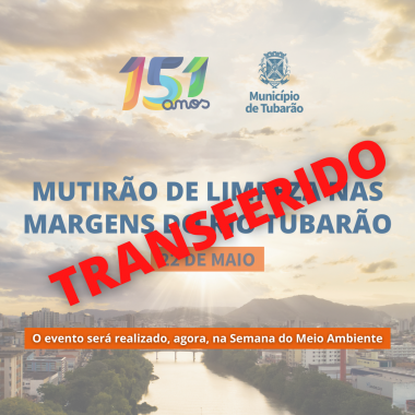 O mutirão de limpeza que aconteceria neste sábado (22) e que marcaria o início oficial da programação do aniversário de 151 anos de Tubarão foi transferido por conta da possibilidade de ocorrência de chuva. Com isso, a ação ocorrerá para o início do mês de junho durante a Semana Mundial do Meio Ambiente.