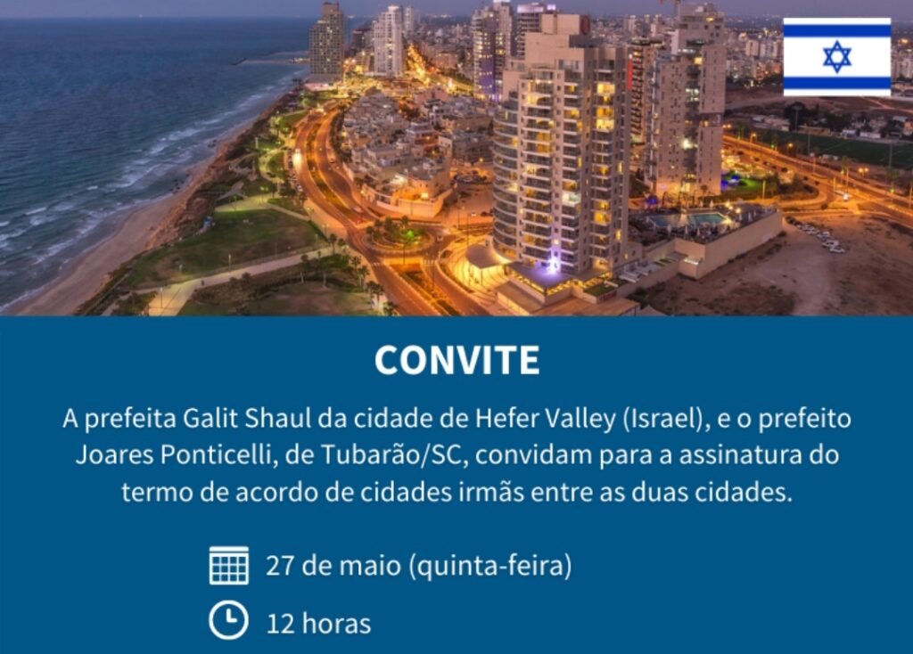 Separadas por 11.100 quilômetros de distância, Tubarão e Hefer Valley, em Israel, serão oficialmente cidades-irmãs nesta quinta-feira (27), ao meio-dia horário de Brasília (18h horário de Israel). Será um momento histórico para Tubarão, que no dia em que completa 151 anos de fundação inicia uma estreita relação com um dos países mais desenvolvidos do mundo e que mais investe em pesquisa, ciência, inovação e tecnologia.