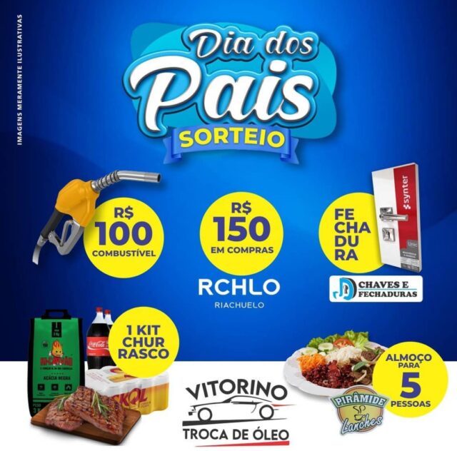 E agora você pode retribuir todo esse amor e carinho, presenteando o seu pai com esses incríveis prêmios, que a Vitorino troca de óleo está sorteando, os prêmios são: R$100,00 reais em combustível, mais R$150,00 reais de compras na riachuelo, 1 kit churrasco, um almoço para 5 pessoas na pirâmide lanches, e uma fechadura da chaves e fechaduras.