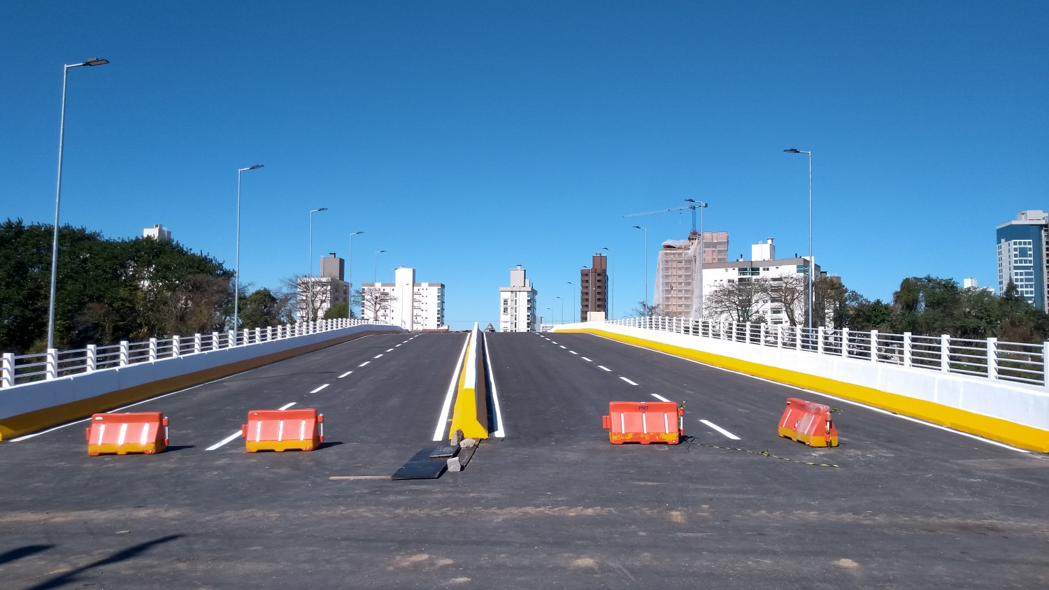 Os trabalhos complementares na ponte Prefeito Paulo Osny May, que ligará as ruas Uruguai, na margem direita, e Padre Nóbrega, na margem esquerda, seguem em ritmo intenso para que a estrutura possa ser aberta ao tráfego de veículos nas próximas semanas. Nesta quinta-feira (29), a sinalização horizontal nas pistas e na ciclovia e a aplicação da pintura no guarda-corpo e em outros componentes deram uma nova roupagem à estrutura.