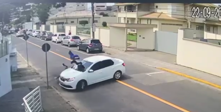 Um grave acidente entre um carro e uma moto foi registrado por câmeras de segurança na Rua Lauro Müller, próximo ao Colégio São José. Um motociclista de 20 anos foi arremessado de sua moto após colidir com um carro.