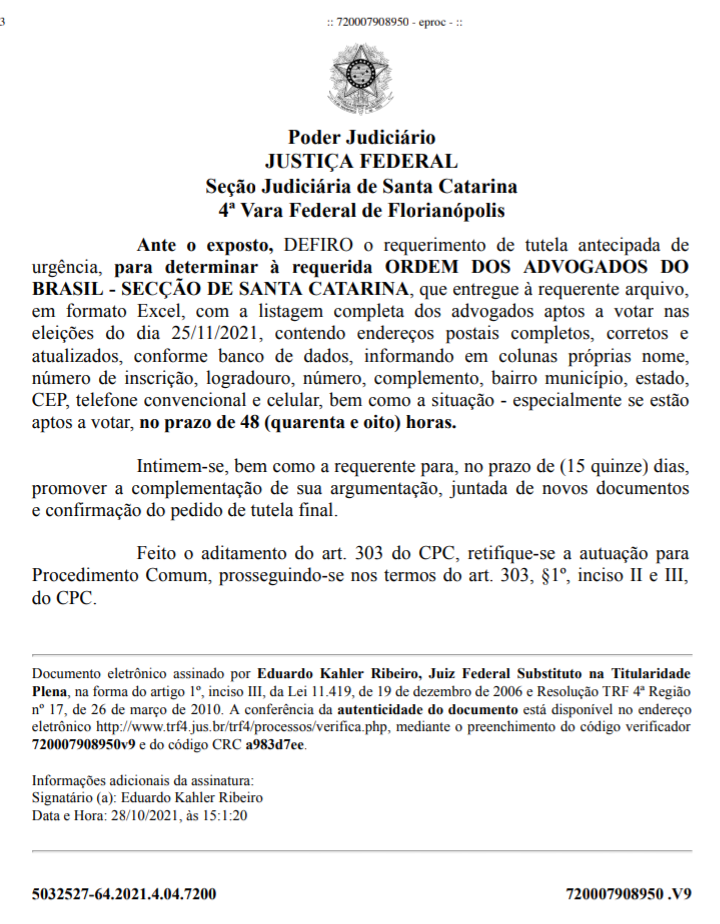 A 4ª Vara da Justiça Federal deferiu liminar em favor da candidata à presidência da OAB/SC pela chapa 2, Vívian De Gann, em ação que determina à Seccional que forneça em até 48 horas o mailing com os contatos dos advogados de Santa Catarina.
