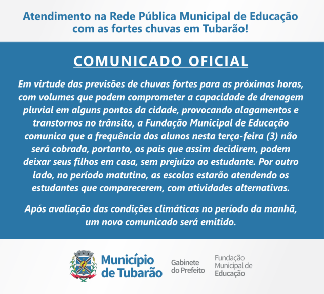 Em virtude das fortes chuvas previstas para os próximos dias, a Fundação Municipal de Educação emitiu um comunicado onde orienta os pais e responsáveis a deixarem seus filhos em casa nesta terça-feira (3), pois não haverá prejuízo do dia letivo aos alunos.