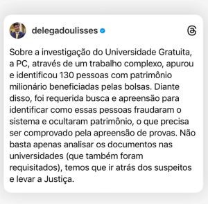 “Parabéns pelo trabalho da Defraudações da DEIC nos últimos anos. A delegacia é hoje uma referência nacional em investigação de fraudes. Através de um trabalho técnico, foram reunidos elementos que indicam que pessoas com patrimônio milionário foram beneficiadas com bolsas. Para aprofundar as provas, estamos solicitando medidas de busca e apreensão, a fim de verificar como esses bens foram ocultados e como o sistema foi fraudado”, afirmou o delegado.