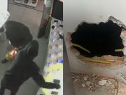 Dupla faz buraco gigante em parede de loja da Magazine Luiza, em Itapema, e leva diversos celulares durante a madrugada; câmeras registraram tudo.
