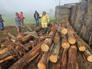 Caminhão tomba e toras caem sobre motociclista