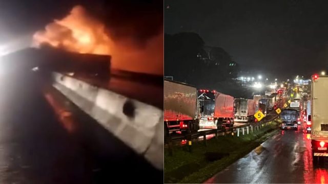 A batida ocorreu no quilômetro 48 da rodovia, em sentido sul, por volta das 04h30. O Corpo de Bombeiros atua no local, onde longas filas já são registradas. De acordo com a Polícia Rodoviária Federasl (PRF), há aproximadamente 15 quilômetros de congestionamento no sentido Norte e 12 quilômetros no sentido Sul. Não há previsão de liberação.