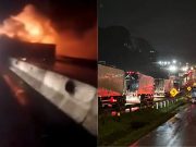 Caminhão carregado com botijões de gás colidiu contra uma estrutura e pegou fogo