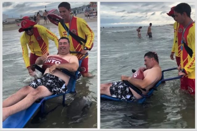 Guarda-vidas auxiliam pessoa com mobilidade reduzida