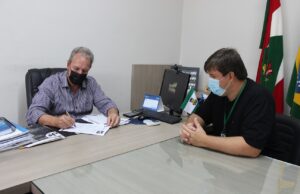 O prefeito de São Ludgero, Ibaneis Lembeck, o Iba, e o secretário de Administração, Finanças e Planejamento, Léo Füchter, assinaram a Lei...