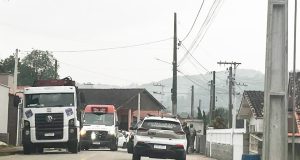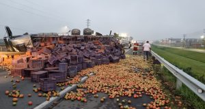 Caminhão carregado com tomates tomba na BR-101 em Sangão