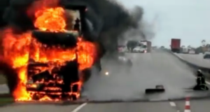 Uma carreta pegou fogo na BR-101 em Laguna