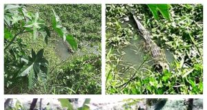 Jacarés são avistados em valo perto de casas no bairro Humaitá...